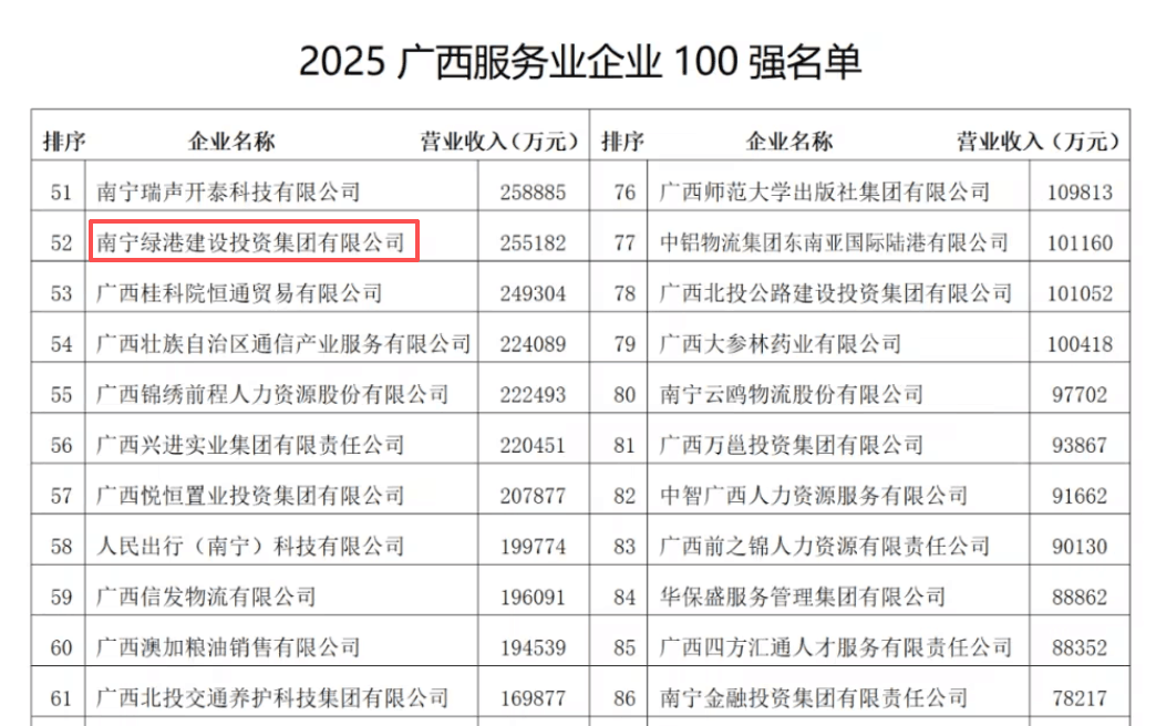近日,廣西企業(yè)與企業(yè)家聯(lián)合會(huì)、廣西工業(yè)經(jīng)濟(jì)聯(lián)合會(huì)聯(lián)合發(fā)布“2025廣西服務(wù)業(yè)企業(yè)100強(qiáng)”榜單。南寧五象經(jīng)投集團(tuán)下屬企業(yè)綠港集團(tuán)憑借穩(wěn)健的綜合實(shí)力、突出的發(fā)展成效,第4次榮登該榜單并位列52位,彰顯了公司在服務(wù)區(qū)域發(fā)展、推動(dòng)產(chǎn)業(yè)升級(jí)中的堅(jiān)實(shí)底氣與強(qiáng)勁動(dòng)能。